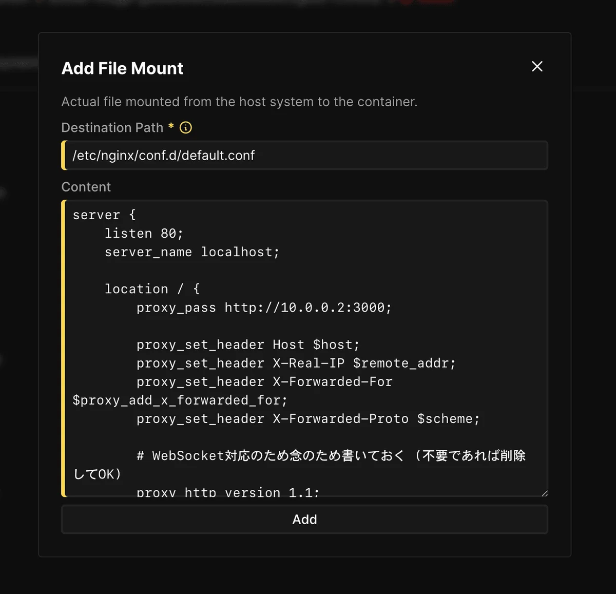 仕方ないのでCoolify側でリバースプロキシ用のプロジェクトを作成し、ドメインを紐づけたnginxのコンテナを起動し、リバースプロキシ用のnginx.confを注入することによってやりたいことが実現できたので、備忘録がてらその手順をご紹介します。