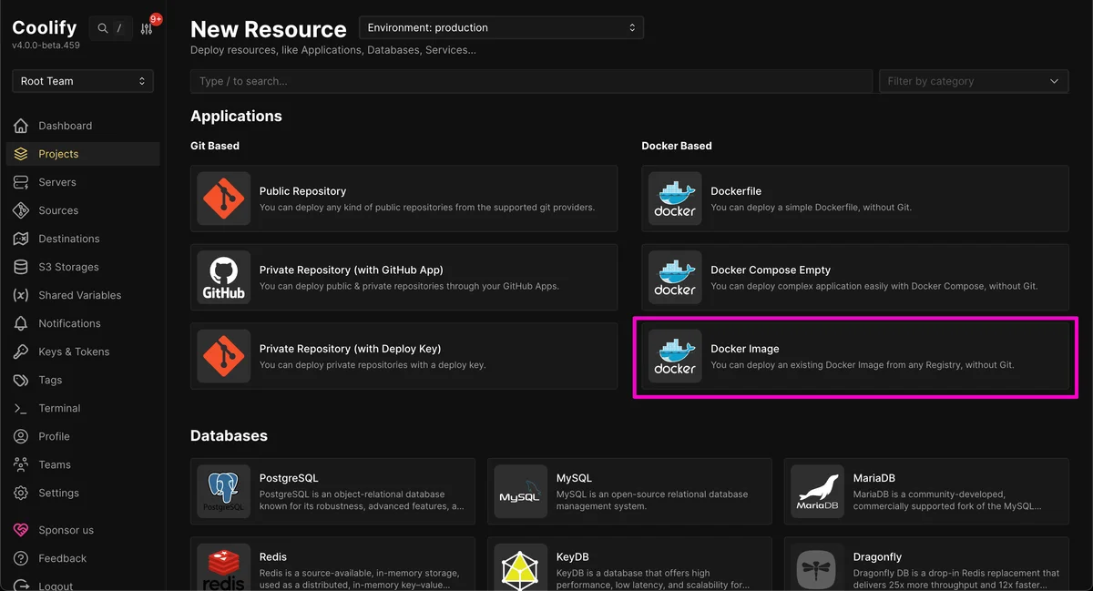適当なプロジェクトを作成、リソース追加画面に遷移したらDocker Imageを選択する。