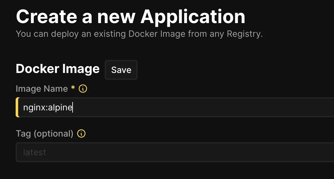 Create a new Application画面に行くのでImage Nameフィールドにnginx:alpineと入力して進む。