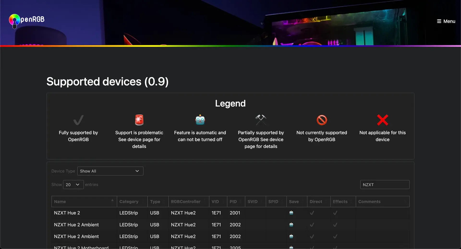 LEDデバイスごとの対応状況はこちらから確認することができ、自宅サーバーで使用しているNZXT Hue2も対応しています。